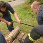 Während eine Gruppe von unserem Gruppensprecher eine Anleitung zum Aufbau der Bockleiter erhielt und dies praktisch übte, erklärte der Jugendwart, wie man eine Leiter als Behelfskrankentrage verwendet und den Verletzten daran sichert.